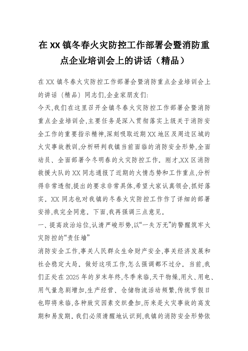 在XX镇冬春火灾防控工作部署会暨消防重点企业培训会上的讲话(精品)