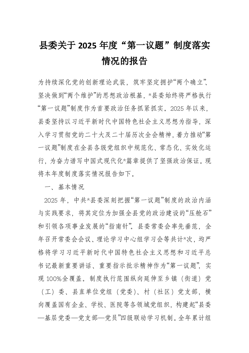 首页材料汇编县委关于2025年度“第一议题”制度落实情况的报告