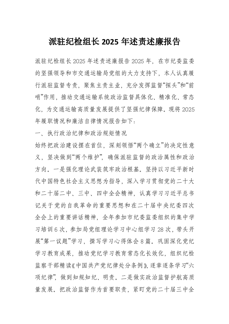 派驻纪检组长2025年述责述廉报告
