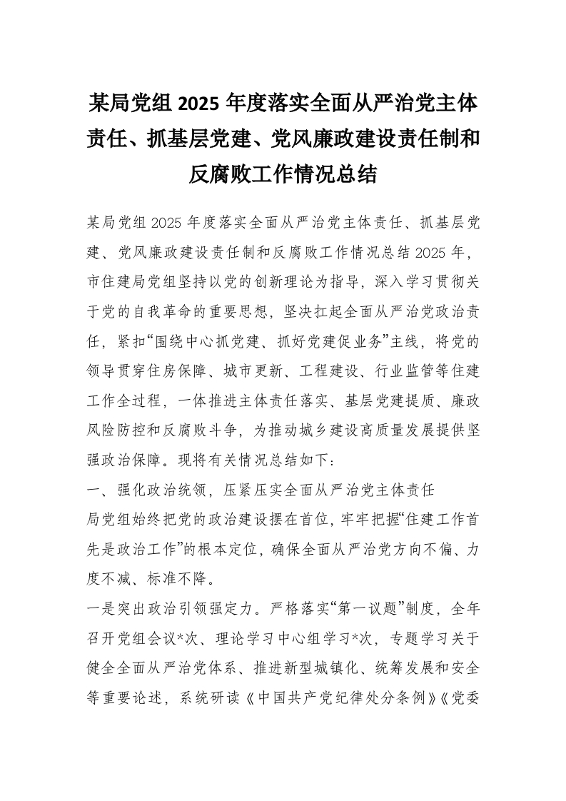 某局党组2025年度落实全面从严治党主体责任、抓基层党建、党风廉政建设责任制和反腐败工作情况总结