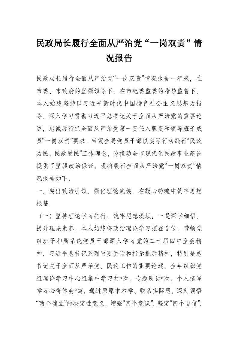 民政局长履行全面从严治党“一岗双责”情况报告