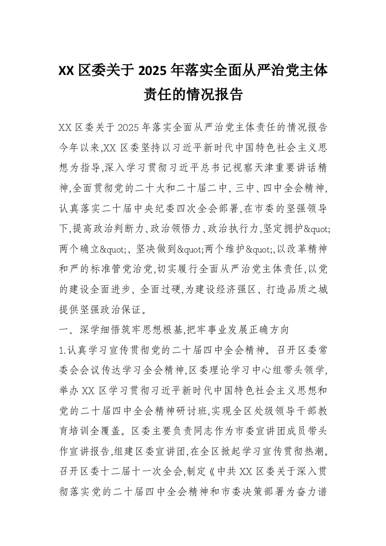 XX区委关于2025年落实全面从严治党主体责任的情况报告