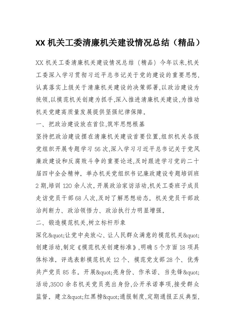 XX机关工委清廉机关建设情况总结(精品)