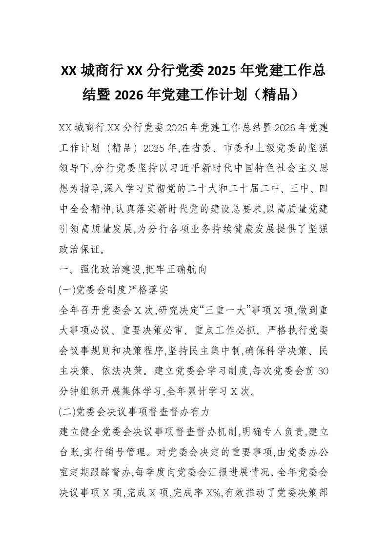 XX城商行XX分行党委2025年党建工作总结暨2026年党建工作计划(精品)