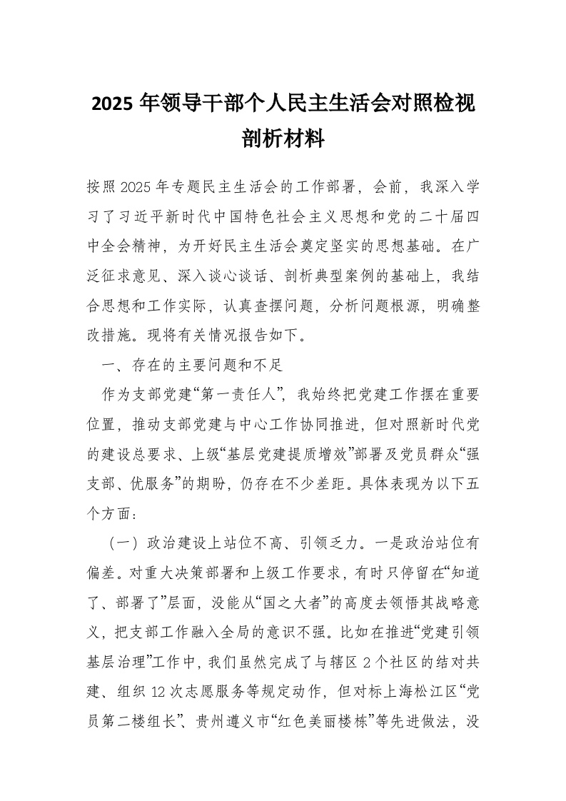 首页讲课讲稿2025年领导干部个人民主生活会对照检视剖析材料