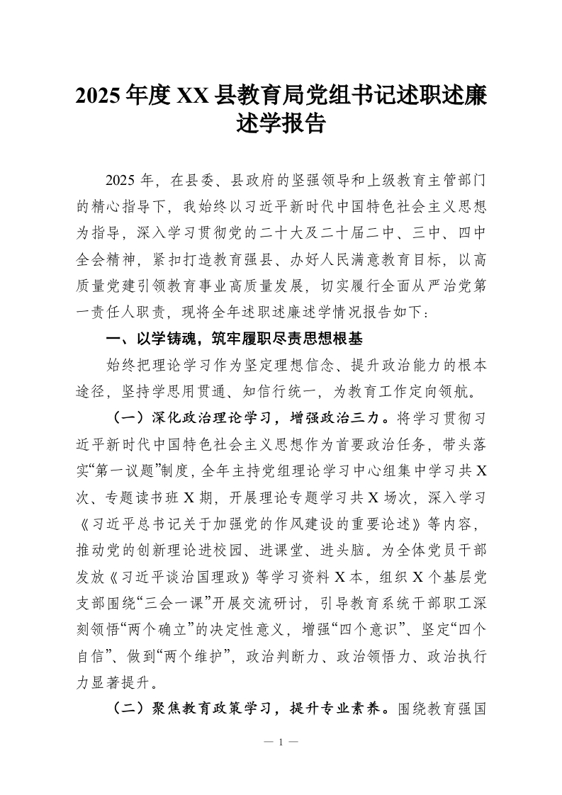 2025年度XX县教育局党组书记述职述廉述学报告