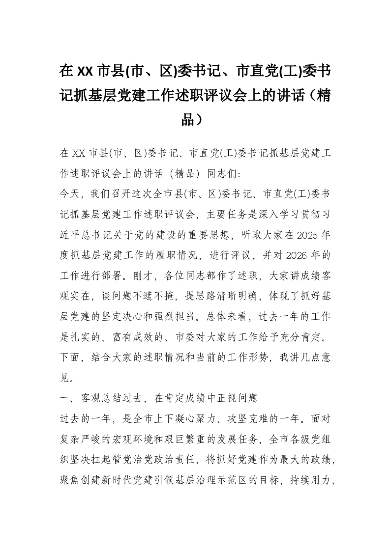 在XX市县(市、区)委书记、市直党(工)委书记抓基层党建工作述职评议会上的讲话(精品)