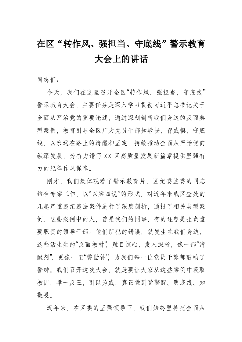 在区“转作风、强担当、守底线”警示教育大会上的讲话