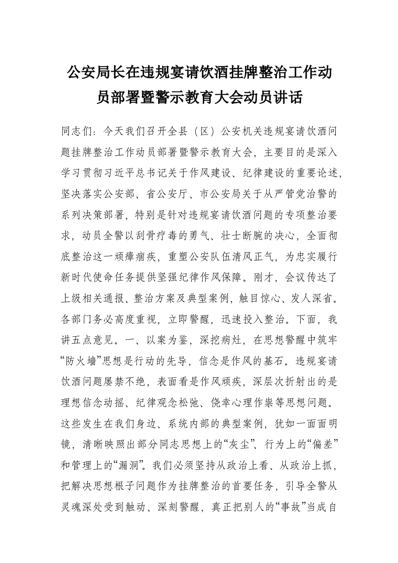 公安局长在违规宴请饮酒挂牌整治工作动员部署暨警示教育大会动员讲话