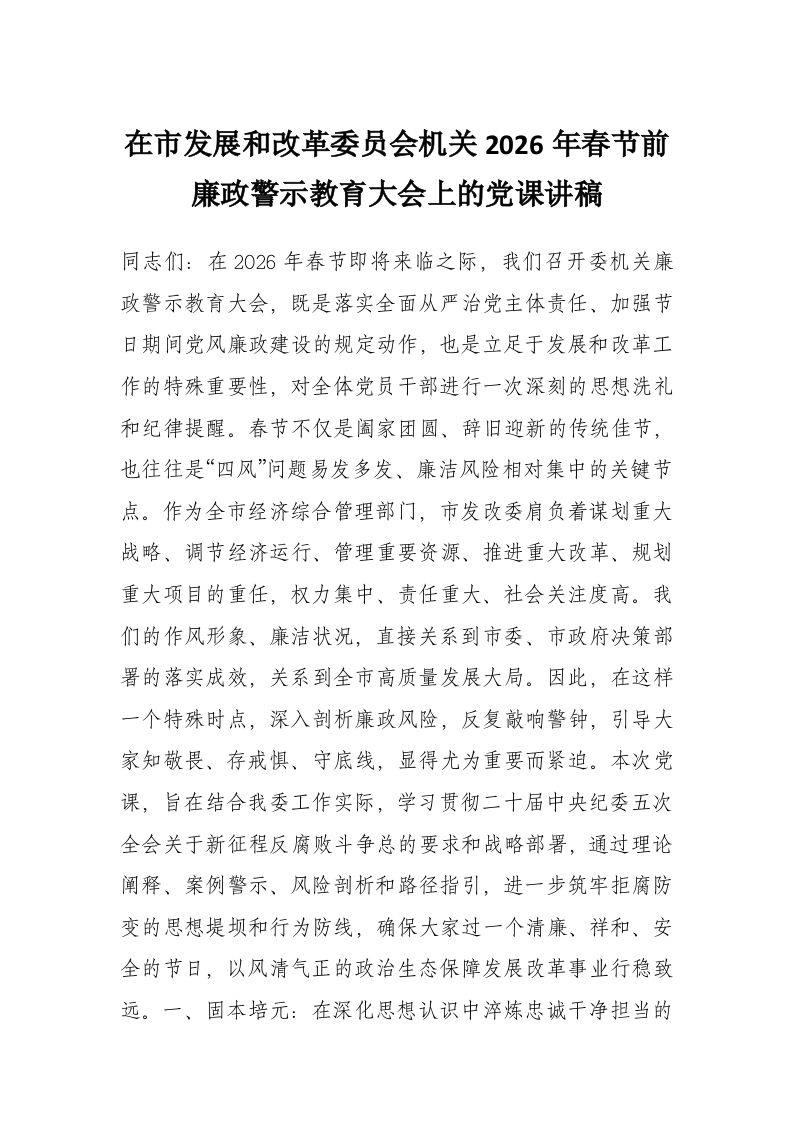 在市发展和改革委员会机关2026年春节前廉政警示教育大会上的党课讲稿