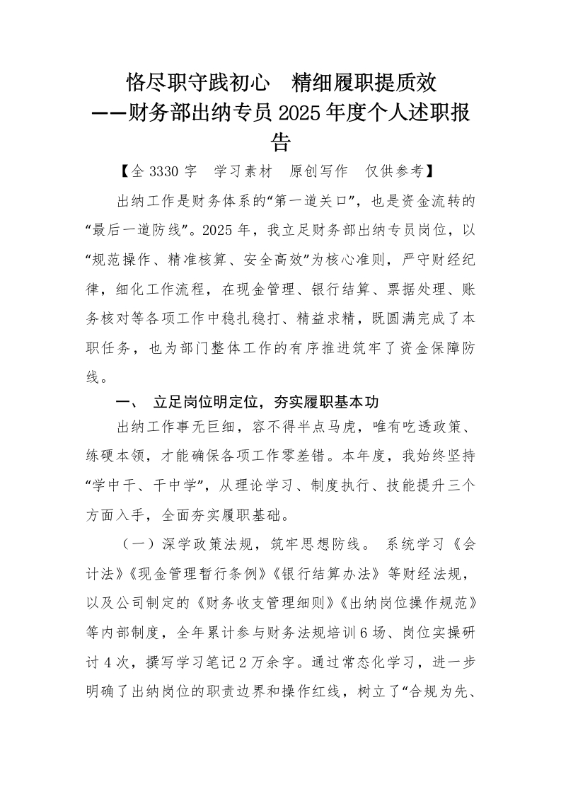 恪尽职守践初心 精细履职提质效——财务部出纳专员2025年度个人述职报告