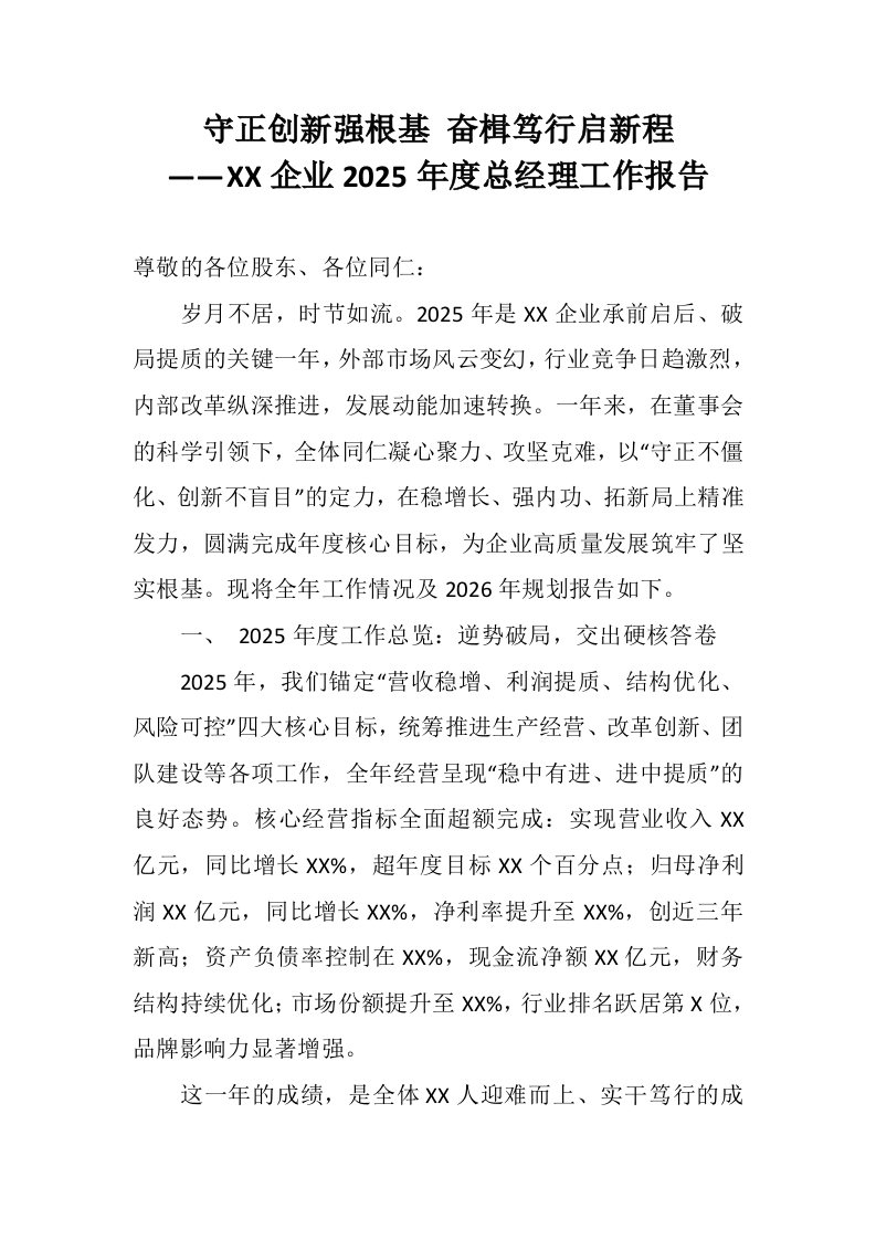 守正创新强根基 奋楫笃行启新程——XX企业2025年度总经理工作报告