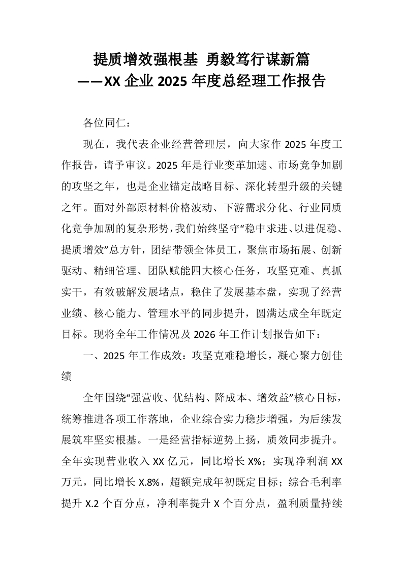 提质增效强根基 勇毅笃行谋新篇——XX企业2025年度总经理工作报告