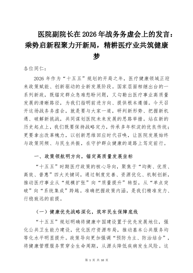 医院副院长在2026年战务务虚会上的发言:乘势启新程聚力开新局,精耕医疗业共筑健康梦