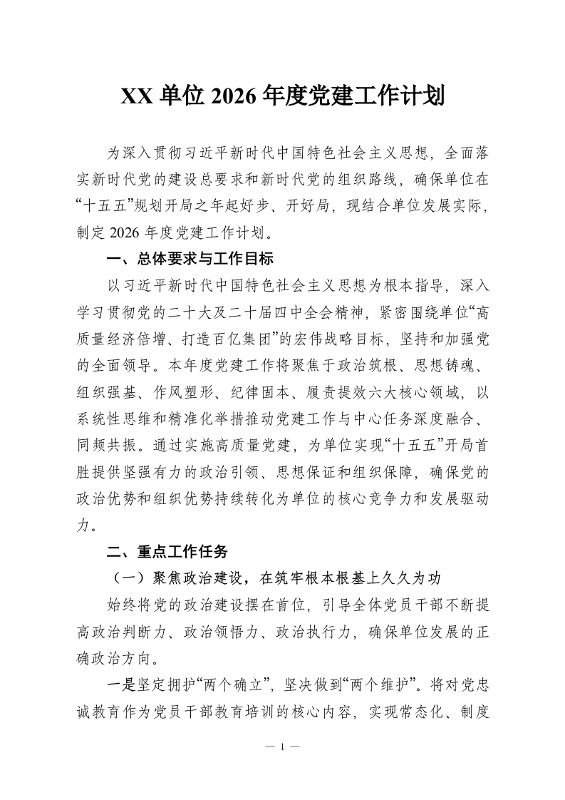 XX单位2026年度党建工作计划