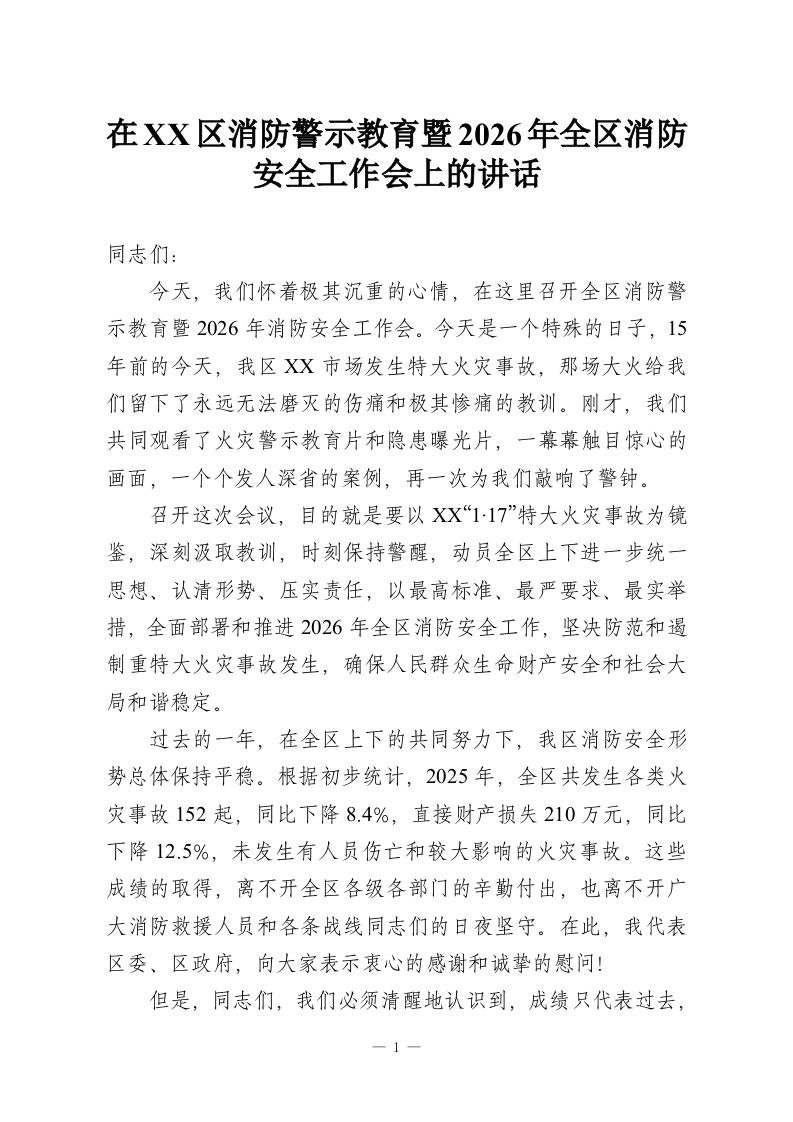 在XX区消防警示教育暨2026年全区消防安全工作会上的讲话