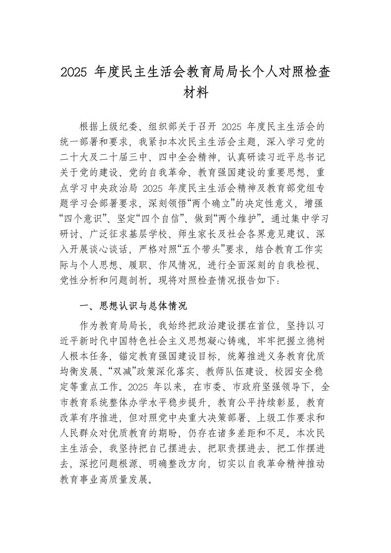 2025年度民主生活会教育局局长个人对照检查材料