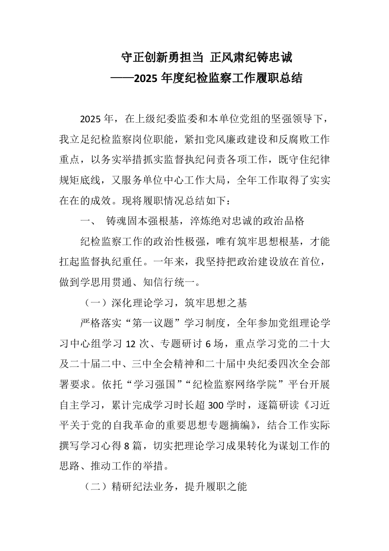 首页工作文档守正创新勇担当 正风肃纪铸忠诚——2025年度纪检监察工作履职总结