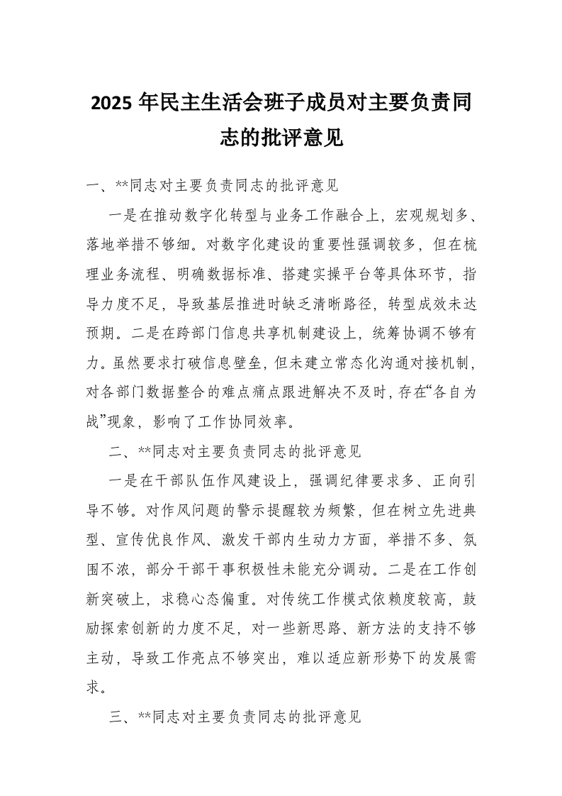 2025年民主生活会班子成员对主要负责同志的批评意见