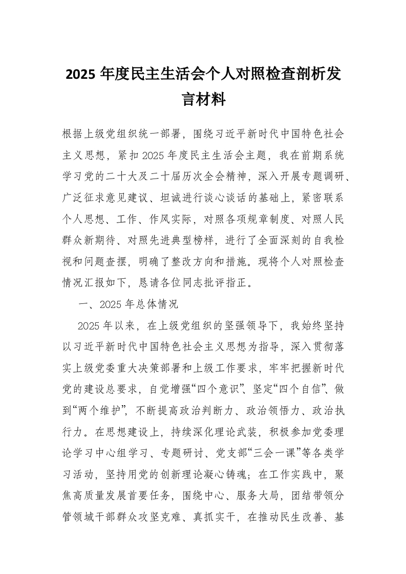 2025年度民主生活会个人对照检查剖析发言材料