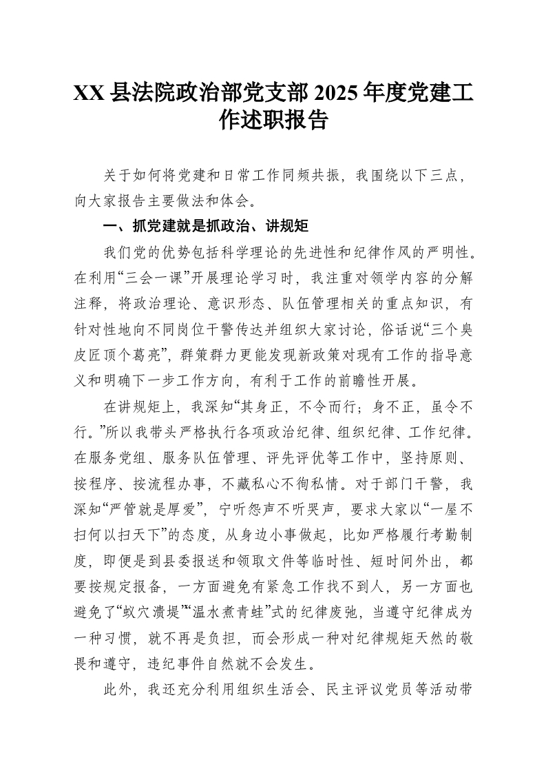 XX县法院政治部党支部2025年度党建工作述职报告