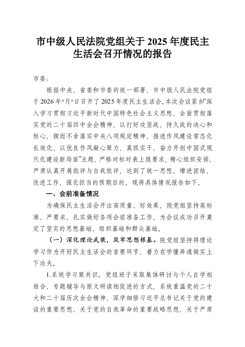 市中级人民法院党组关于2025年度民主生活会召开情况的报告