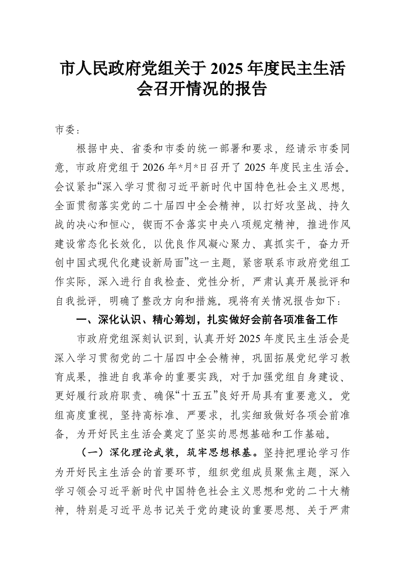 市人民***党组关于2025年度民主生活会召开情况的报告