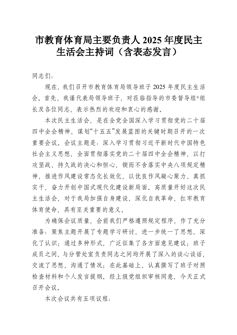 首页学习提升市教育体育局主要负责人2025年度民主生活会主持词(含表态发言)