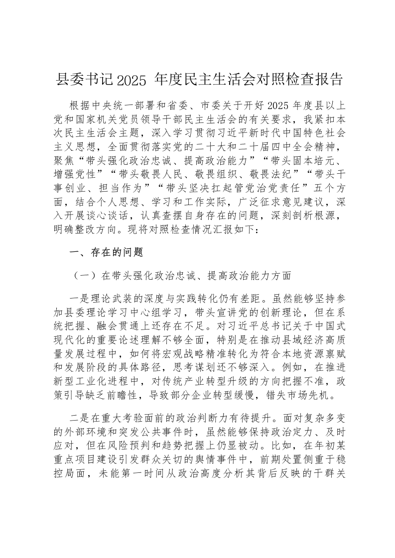 首页写作素材县委书记2025年度民主生活会对照检查报告