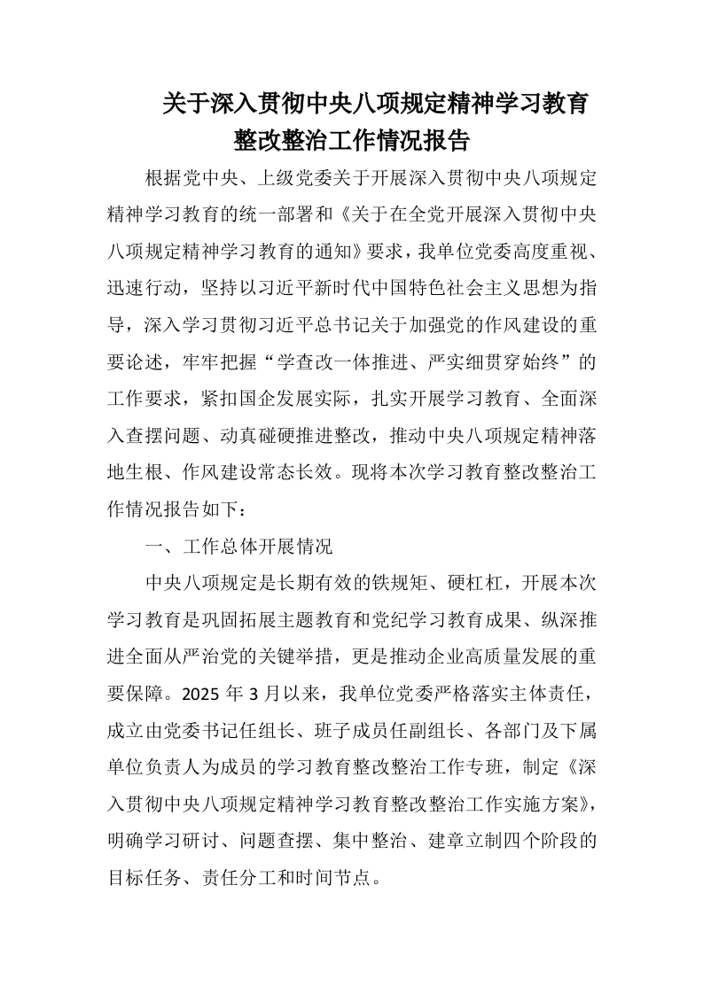 关于深入贯彻中央八项规定精神学习教育整改整治工作情况报告