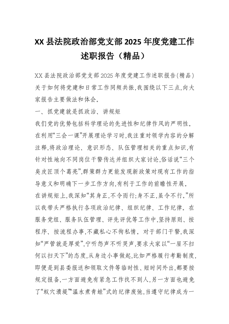 XX县法院政治部党支部2025年度党建工作述职报告(精品)