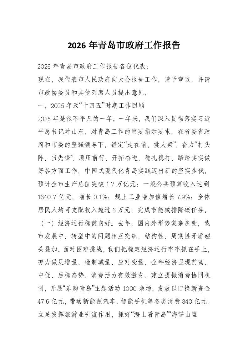2026年青岛市***工作报告