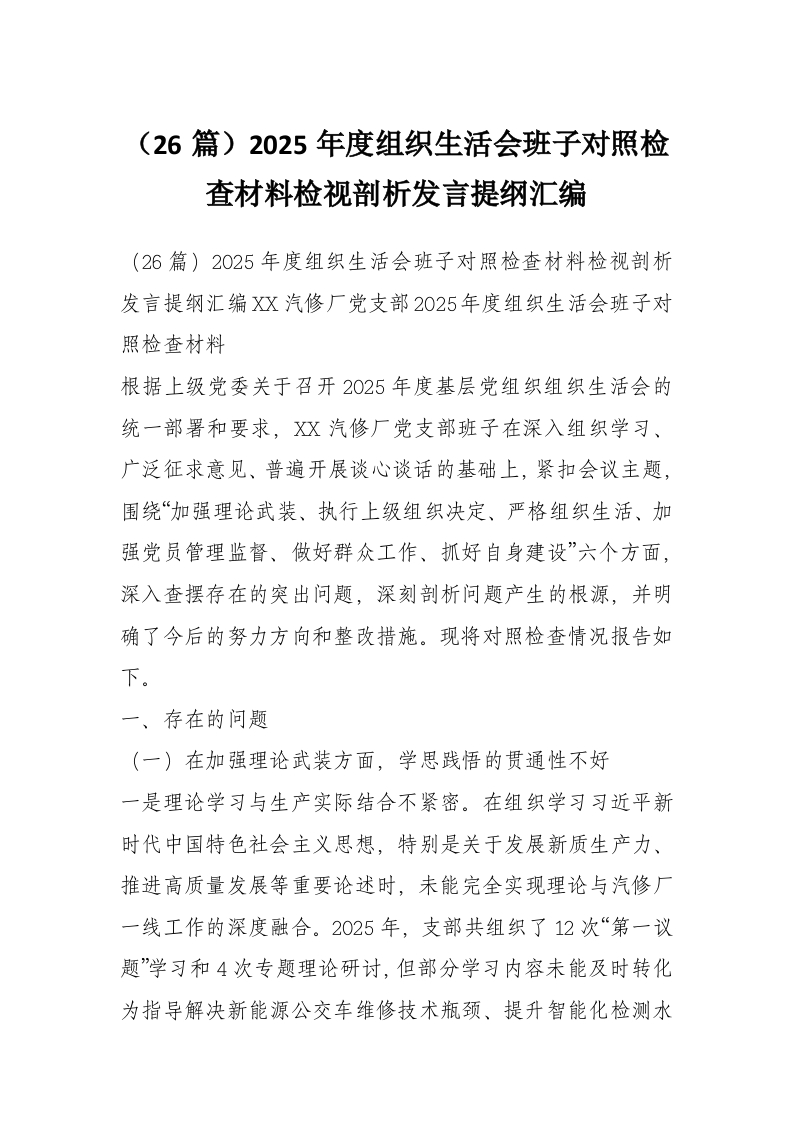 (26篇)2025年度组织生活会班子对照检查材料检视剖析发言提纲汇编