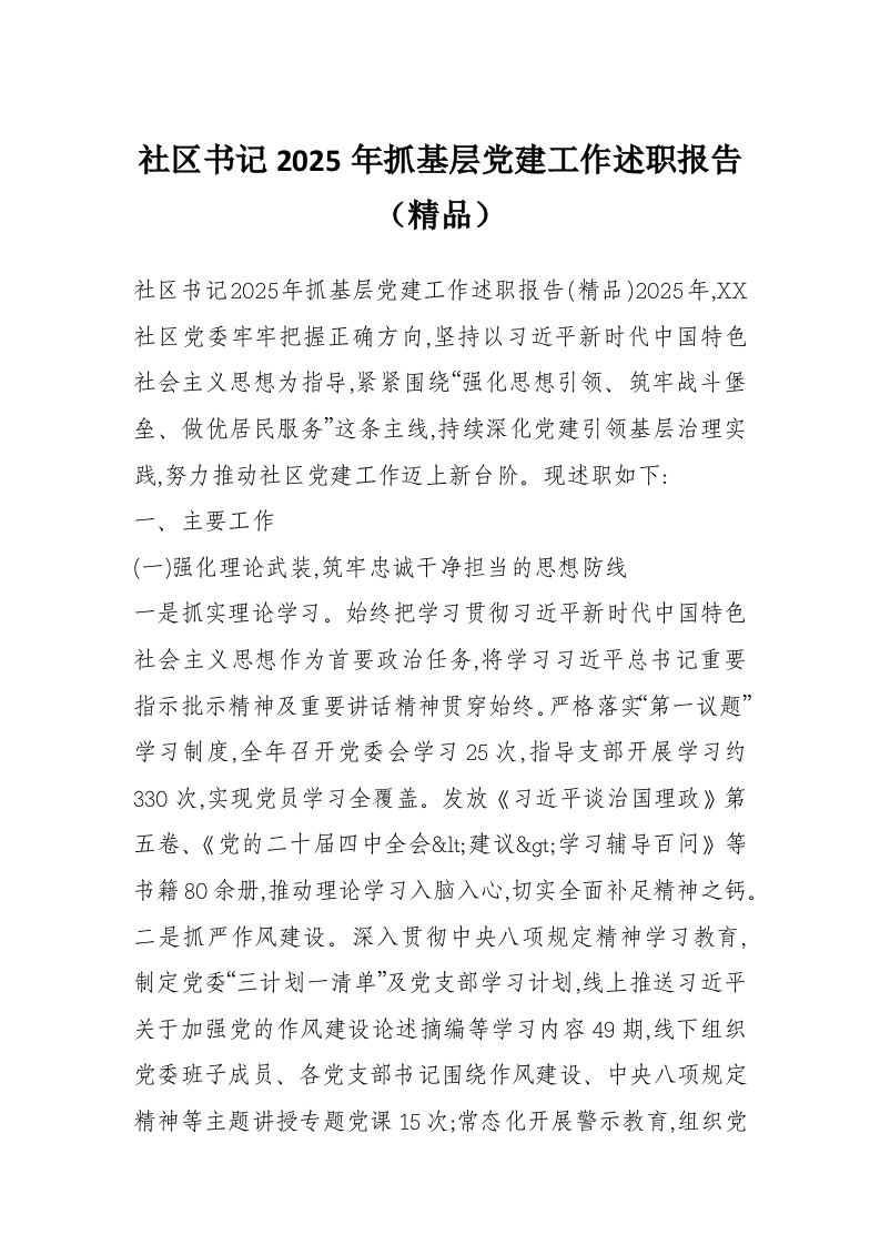 社区书记2025年抓基层党建工作述职报告(精品)