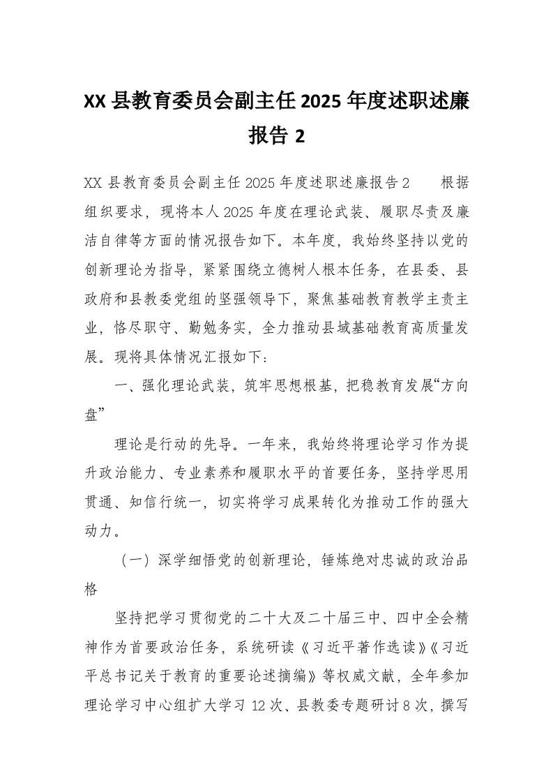 XX县教育委员会副主任2025年度述职述廉报告2