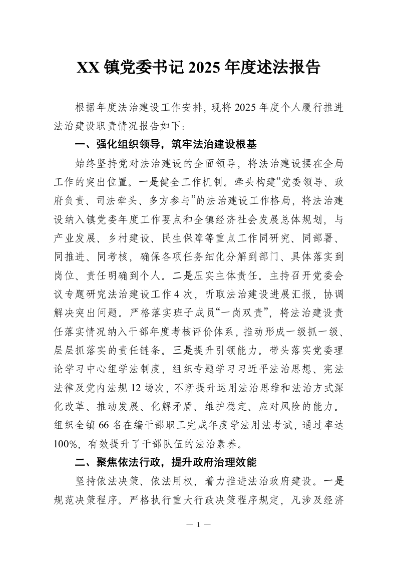 首页工作文档XX镇党委书记2025年度述法报告