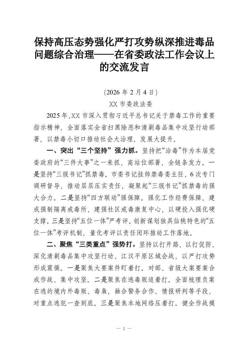 保持高压态势强化严打攻势纵深推进毒品问题综合治理——在省委政法工作会议上的交流发言