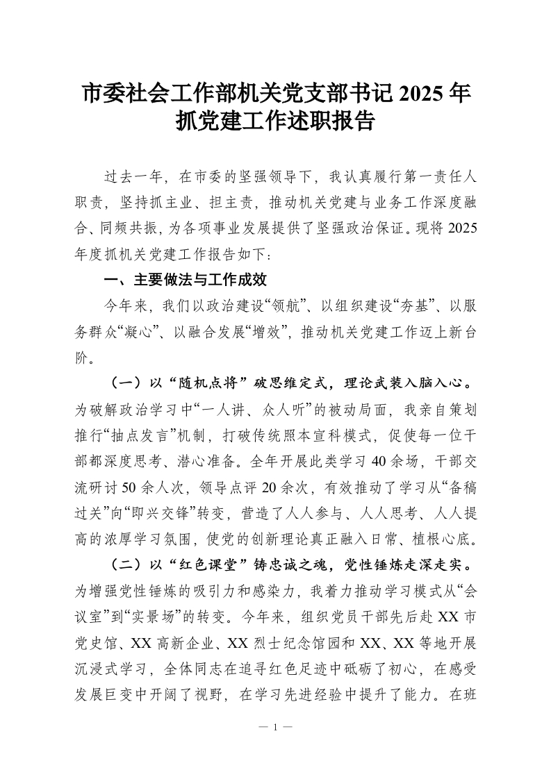 市委社会工作部机关党支部书记2025年抓党建工作述职报告