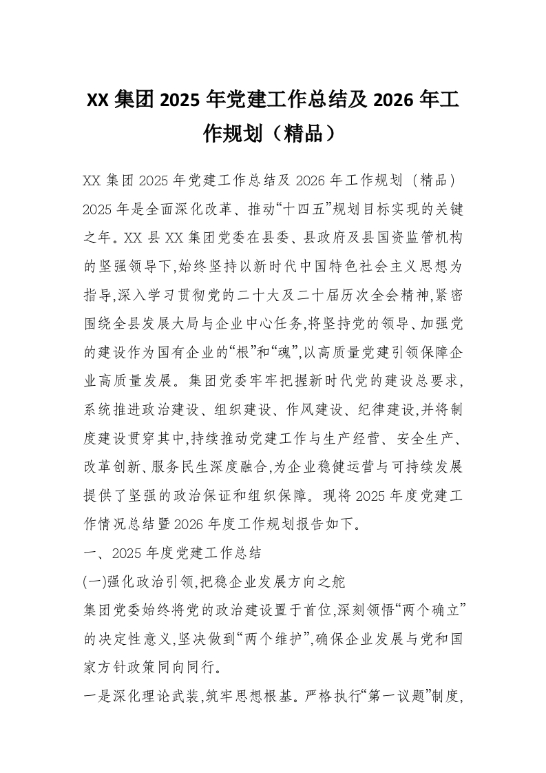 XX集团2025年党建工作总结及2026年工作规划(精品)