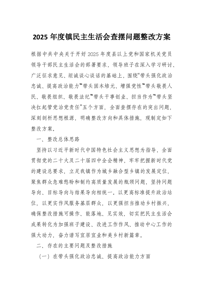 2025年度镇民主生活会查摆问题整改方案