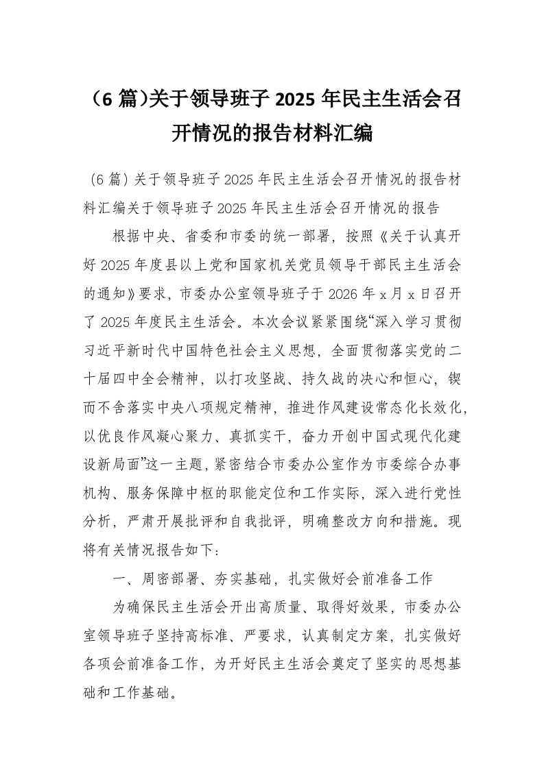 (6篇)关于领导班子2025年民主生活会召开情况的报告材料汇编
