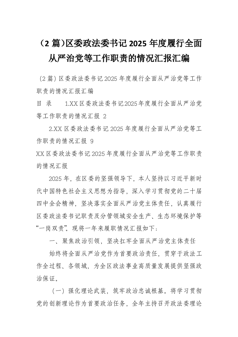 (2篇)区委政法委书记2025年度履行全面从严治党等工作职责的情况汇报汇编