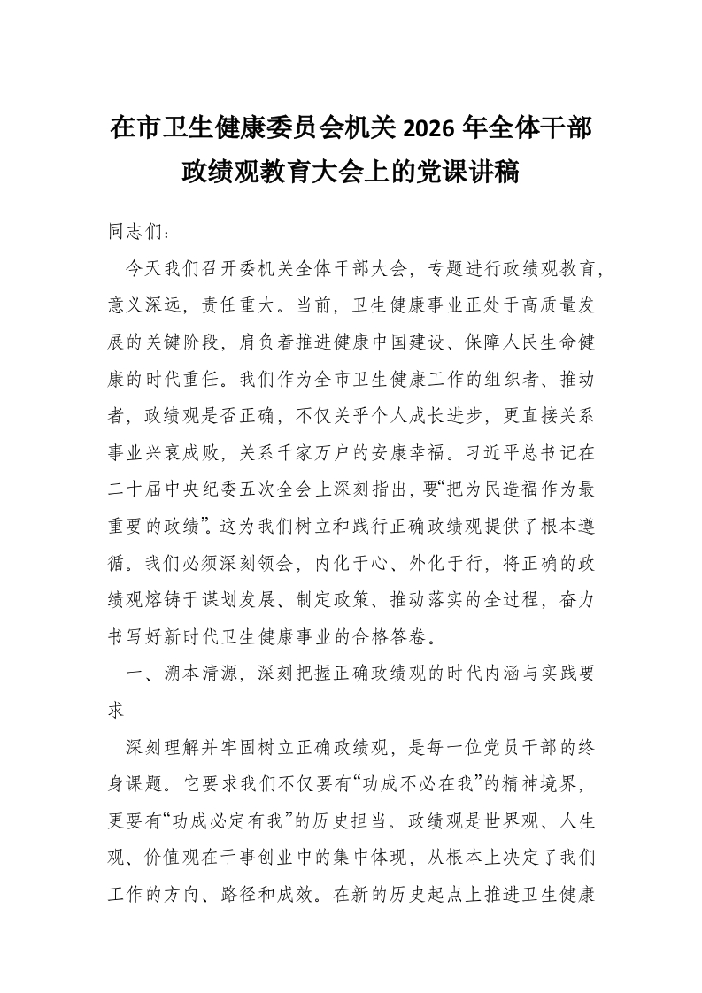 在市卫生健康委员会机关2026年全体干部政绩观教育大会上的党课讲稿