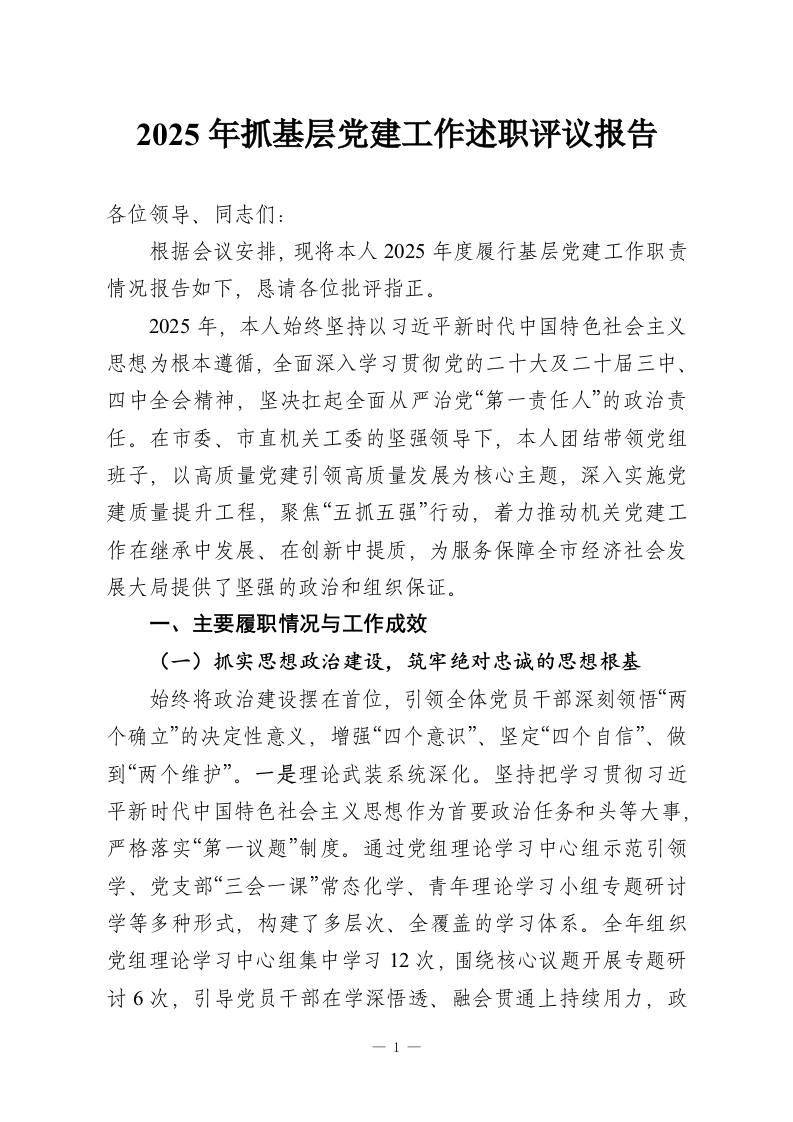 2025年抓基层党建工作述职评议报告