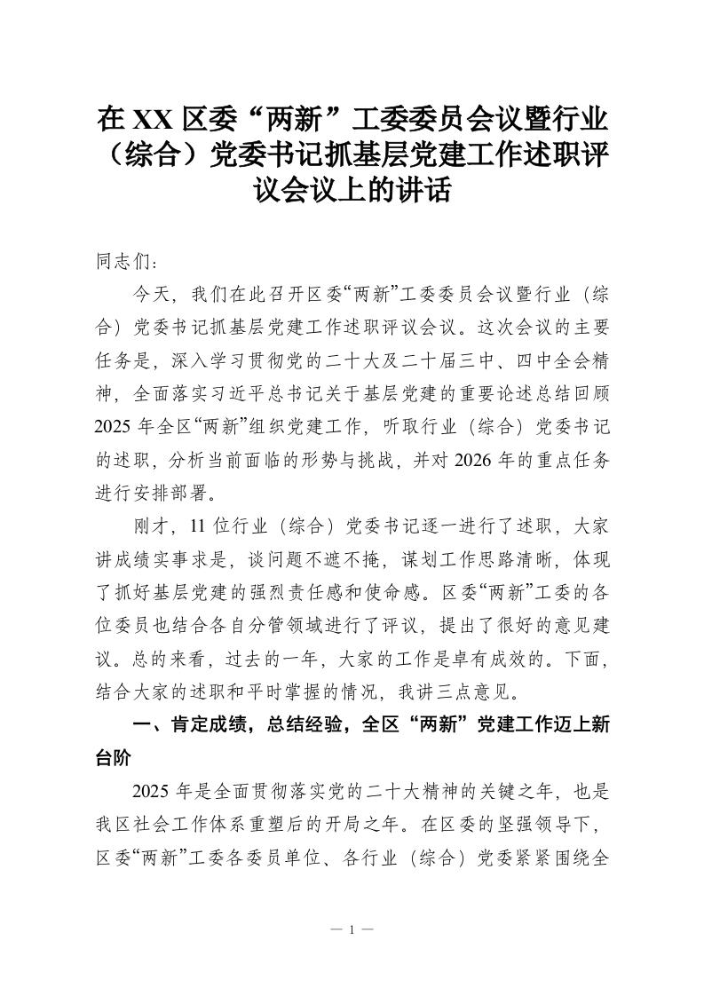 在XX区委“两新”工委委员会议暨行业(综合)党委书记抓基层党建工作述职评议会议上的讲话