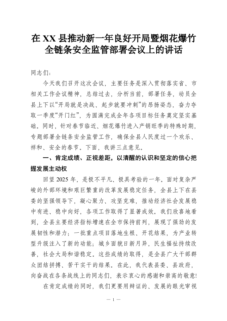 在XX县推动新一年良好开局暨烟花爆竹全链条安全监管部署会议上的讲话