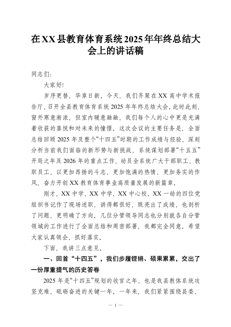 在XX县教育体育系统2025年年终总结大会上的讲话稿