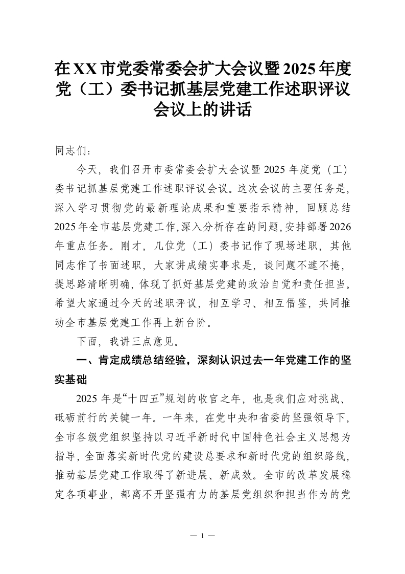 在XX市党委常委会扩大会议暨2025年度党(工)委书记抓基层党建工作述职评议会议上的讲话