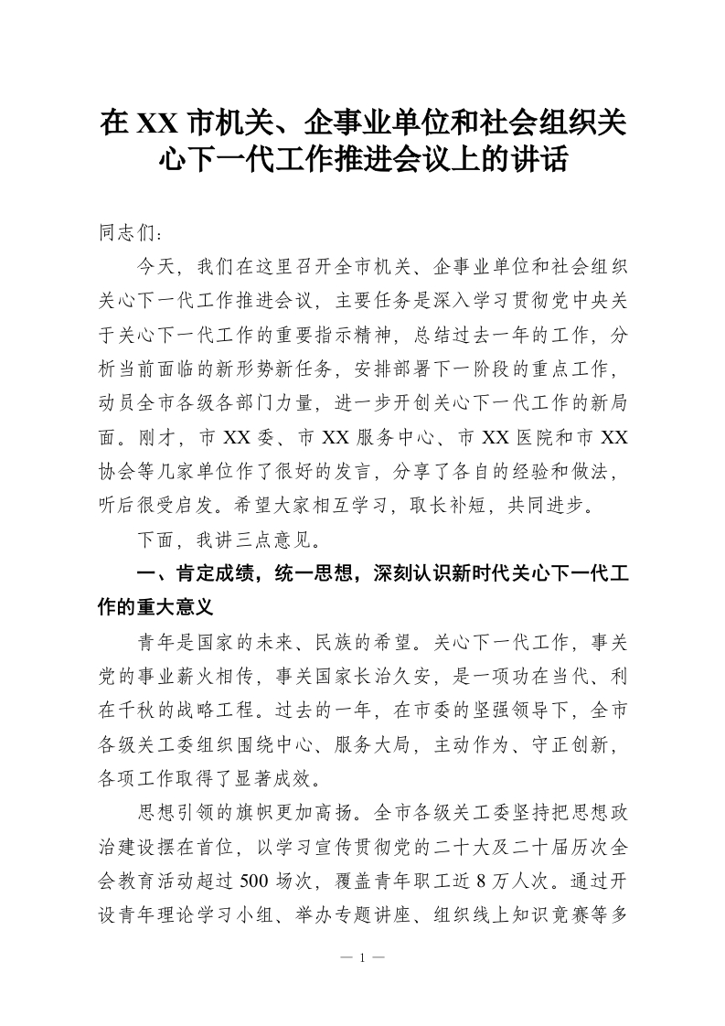 在XX市机关、企事业单位和社会组织关心下一代工作推进会议上的讲话