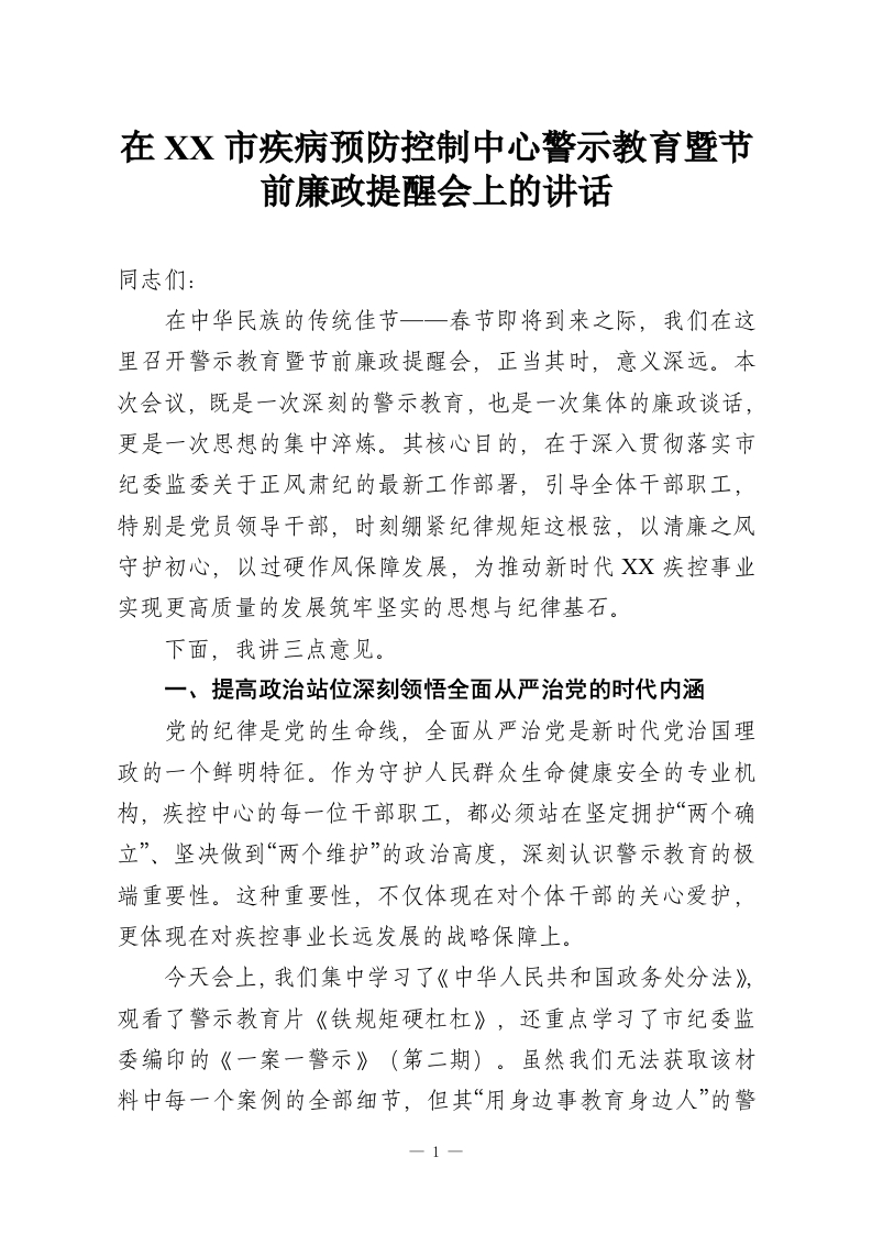 在XX市疾病预防控制中心警示教育暨节前廉政提醒会上的讲话